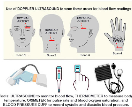 SELECTED AREAS SCANNED WITH ULTRASOUND: Autoregulation of the circulatory system is controlled by several homeostatic mechanisms including the autonomic nervous system, which is believed to be a mechanism by which meditation alters cardiovascular function. As such, evaluating blood vessel flow and function aligns with studying the body’s effects under a meditative state. According to Dr. Robert Bard, the areas of the body scanned with ultrasound are key areas that have the highest probability of response and reaction from a device that claims to promote bringing the subject into a meditative state. The chosen target scan areas (Basilar Artery, Eye/Optic Nerve, Temporal Artery and Radial Artery) are identified as key zones for hemodynamic study, showing the most effective areas for studying blood flow.