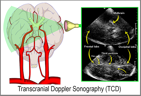 Another imaging innovation is the TRANSCRANIAL DOPPLER (TCD) - a type of sonogram that is a non‐invasive, non‐ionizing, inexpensive, portable and safe technique that uses a pulsed Doppler transducer for assessment of the blood flow in the anterior cerebral arterial circulation. This technology has been used to evaluate intracranial steno‐occlusive disease, subarachnoid hemorrhage, and extracranial diseases (including carotid artery disease and subclavian steal syndrome), detection of microembolic signals and acute strokes. The Transcranial Doppler has been used to examine the mean speed of blood circulation of patients to validate and monitor treatment efficacy by tracking cranial blood vessels and vertebrobasilar flow vasospasm. |