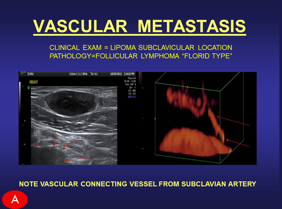 DIGITAL BIOPSY CASES: WHAT ARE YOU ABOUT TO BIOPSY? WHAT HAPPENS AFTER THE NEEDLE INSERTS?Here we have 2 subdermal masses which are non tender and firm with no history of trauma. Case A: The oval mass (dark echoes=suspicious) with irregular vessels (red) was referred as a probable cyst or lipoma. The tumor is highly vascular and connected from the aorta by way of the subclavian feeding artery. Liposuction could result in massive hemorrhage and spread of tumor cells into the circulation.