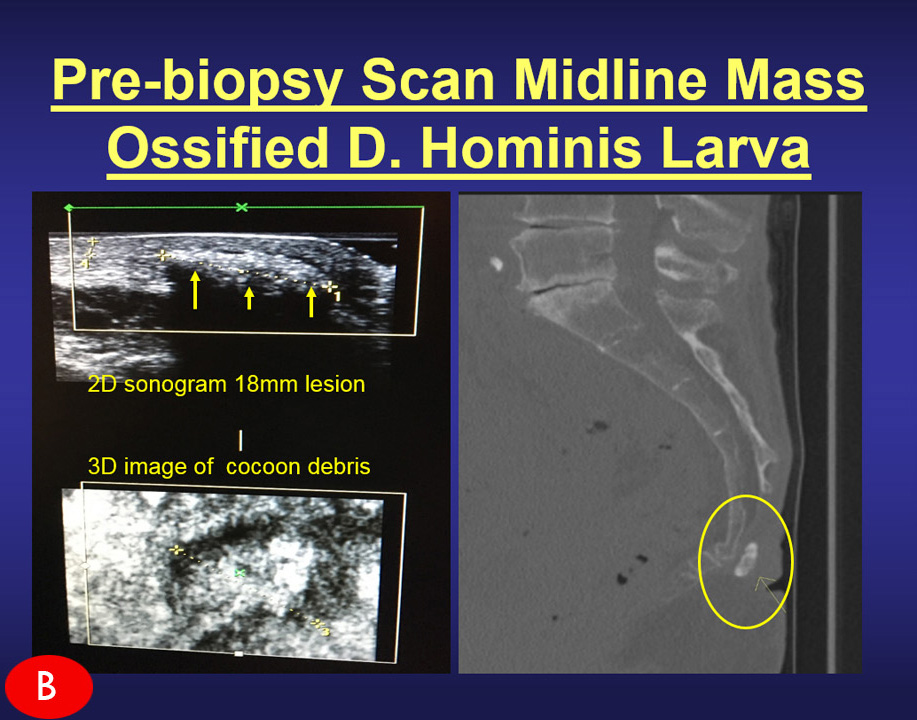 Case B: The ovoid white region (bright echoes=benign) is ossified as confirmed by the CT scan of the coccyx. The sonogram allows you to reassure the patient it is NOT CANCER. It prompts one to avoid a standard needle that could bend, crack or dislodge into the soft tissues requiring further exploration to locate/retrieve the broken metal fragment.